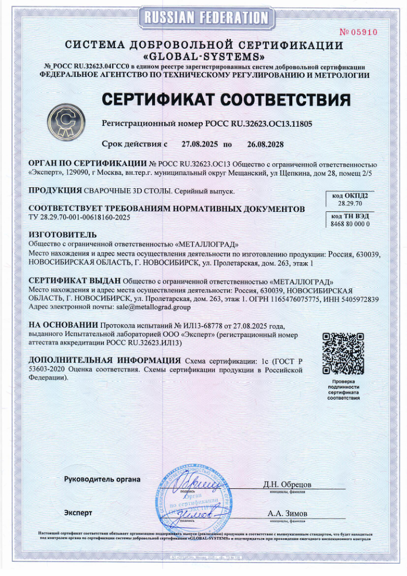 Сертификат соответствия Сварочные 3D столы