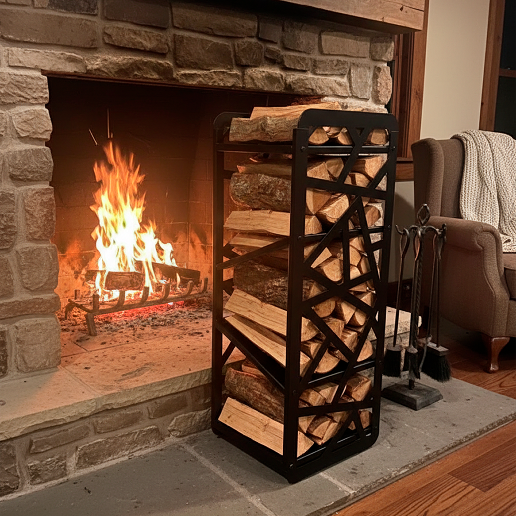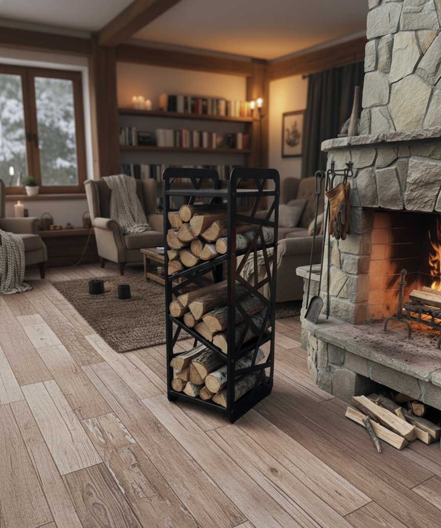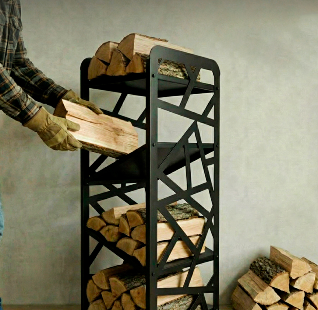 Металлическая конструкция с декоративным узором по бокам сочетает прочность и эстетику. Подходит для аккуратного хранения дров у камина и добавляет помещению выразительный акцент.